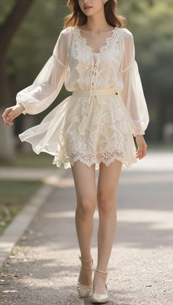Soft focus romance. A flowing sheer blouse with a lace mini.