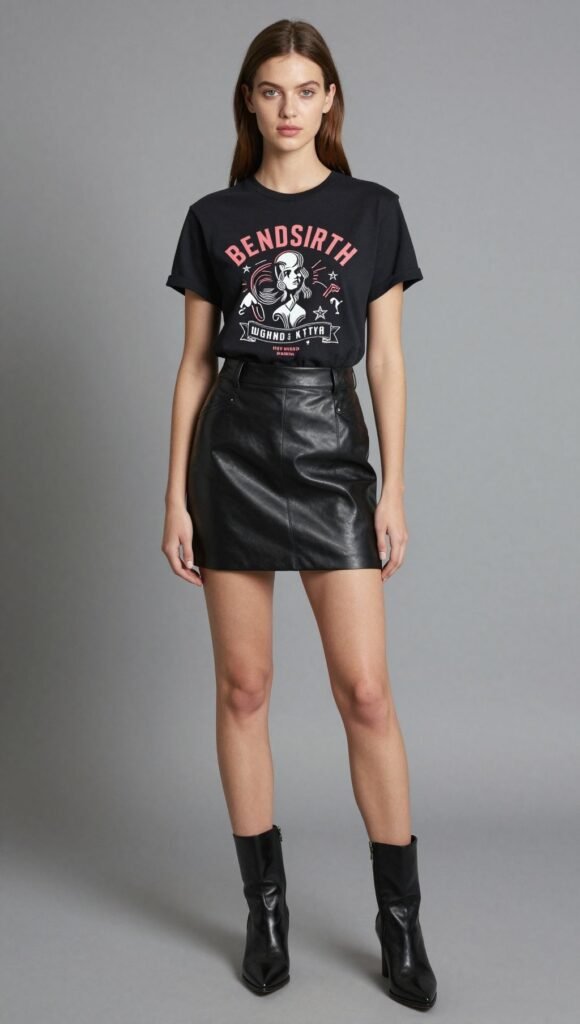 - Items Leather mini, graphic tee, pointed ankle boots.