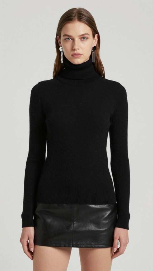Minimalist rebel energy. A monochrome black turtleneck with a sleek mini and statement earrings.
