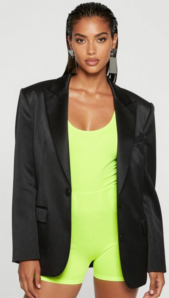 Glow like a highlighter. Think boxy blazer over a neon bodysuit, and bike shorts for contrast.