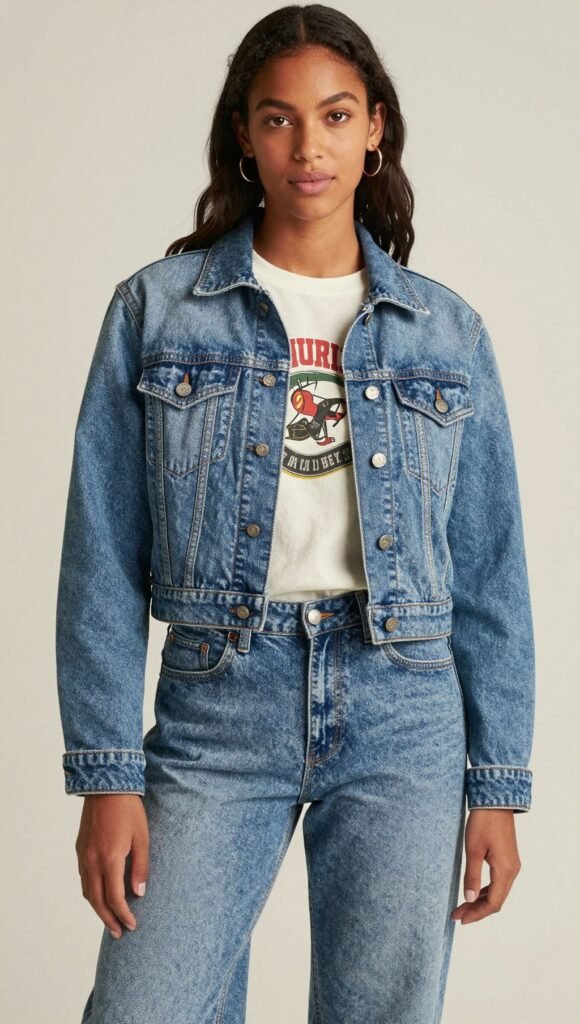 Casual, chatty, cute. Layer a cropped denim jacket over a graphic tee with acid-wash jeans.