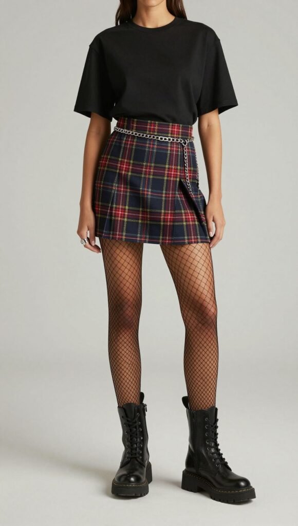 Chaos, but coordinated. Mix a plaid mini skirt with a band tee, fishnets, and chunky boots.