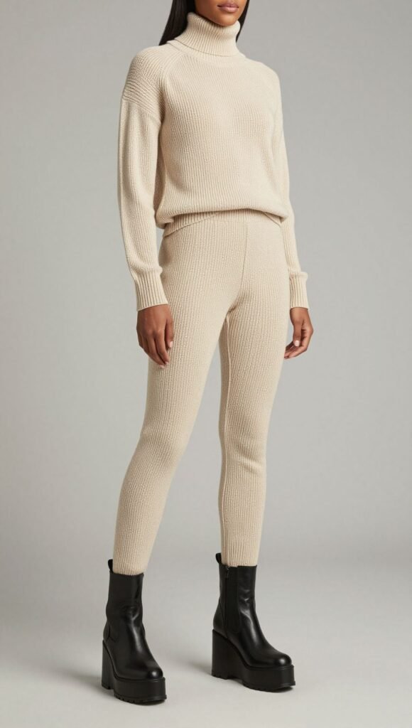 Matchy set, big mood. Try a ribbed knit co-ord with platform ankle boots for height without pain.