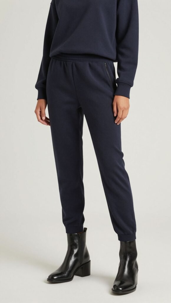 Gym-adjacent, not gym-bound. Style structured joggers with a boxy sweatshirt and polished ankle boots.