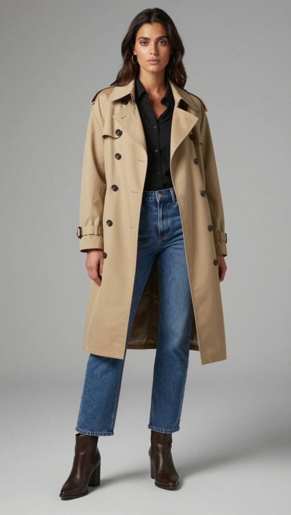 Classic detective, but make it chic. A camel trench, straight-leg jeans, and almond-toe ankle boots deliver effortless style.
