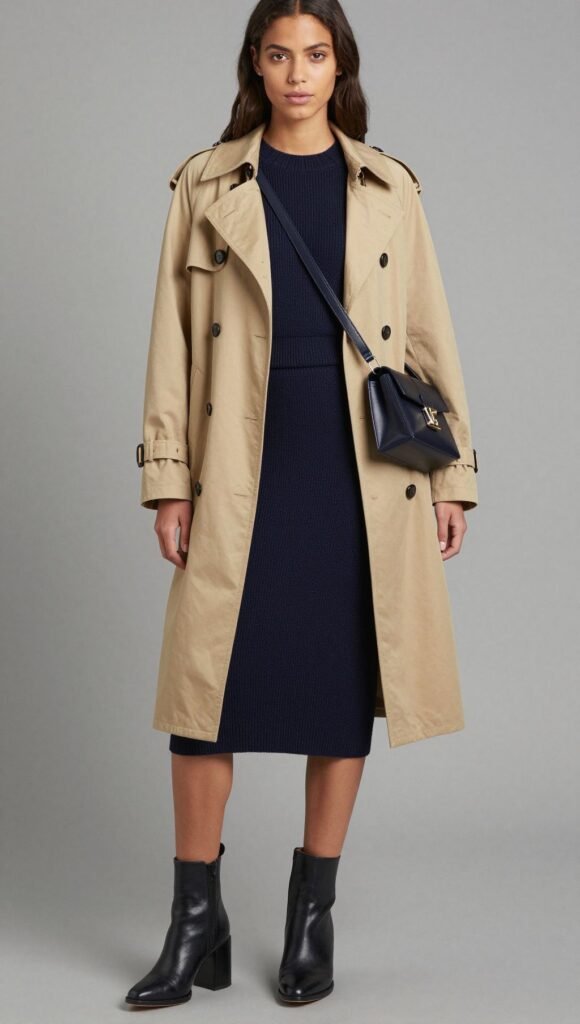 Outerwear as outfit-maker. Throw a sand trench coat over a navy knit set—top and midi skirt. Finish with heeled boots and a structured crossbody.