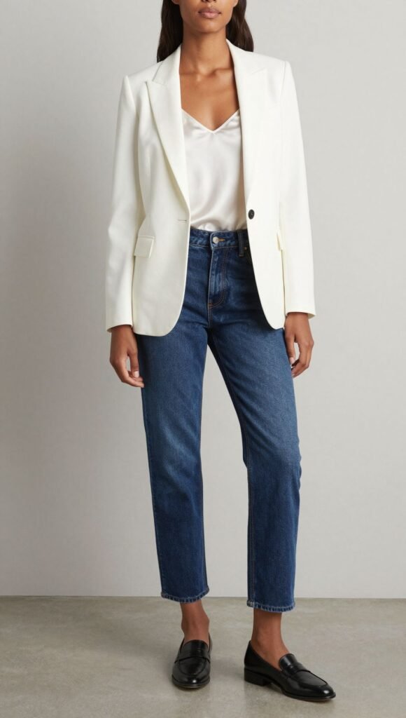 Casual Friday, but still the boss. A white blazer with dark indigo straight jeans and a silk cami keeps it clean. Add sleek loafers or pumps.