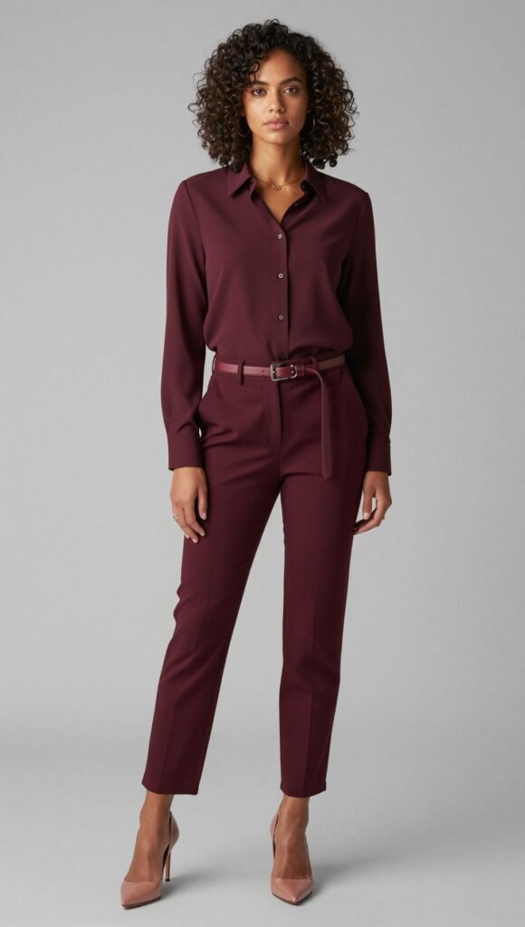 Color, but make it grown-up. Pair a burgundy blouse with wine tailored trousers and a matching belt. Finish with rose-nude pumps and soft gold jewelry.