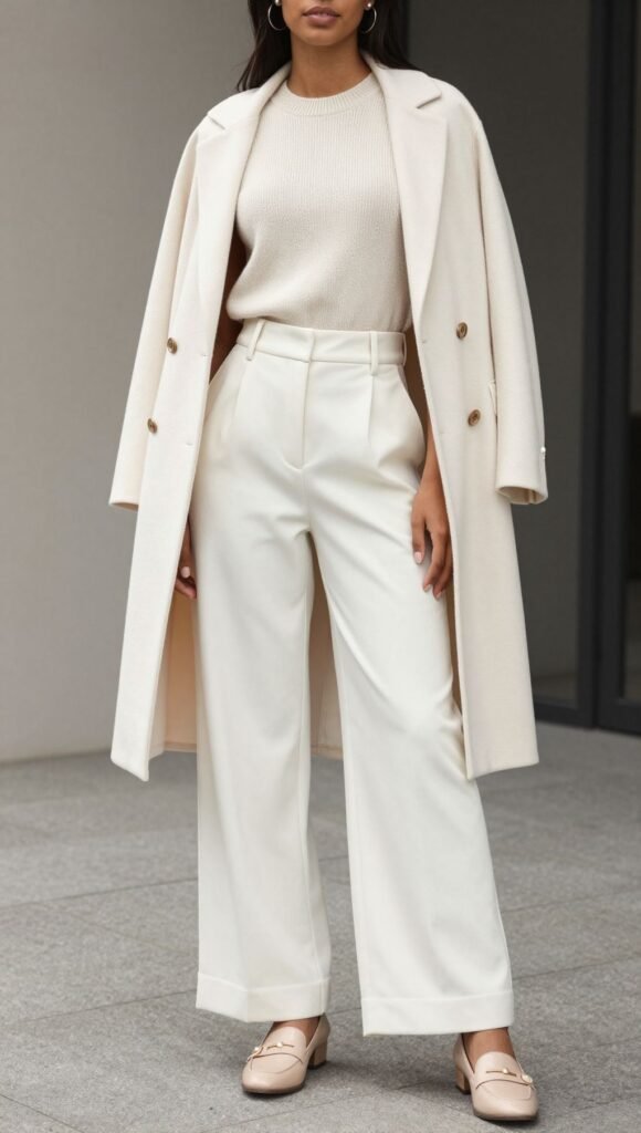 All white, zero stress. Pair an ivory knit shell with high-waist wide-leg trousers and a cream duster blazer. Finish with nude loafers and a pearl stud.