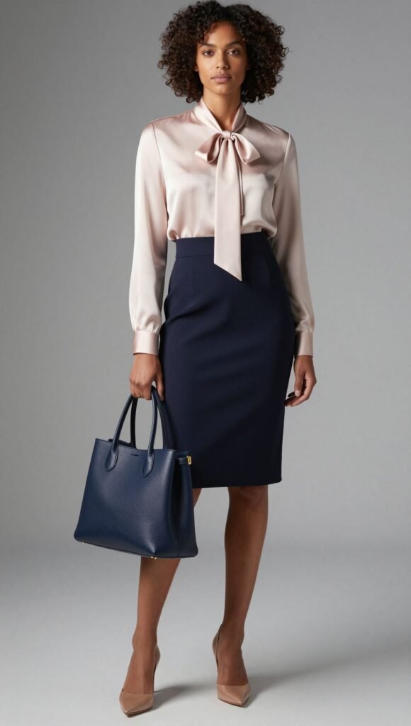 Classic with a soft edge. Wear a navy pencil skirt with a silk tie-neck blouse in soft blush. Add kitten-heel pumps and a structured tote.