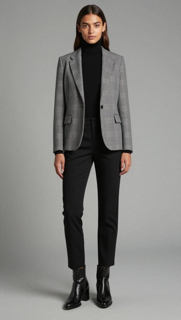 Pattern, but keep it CEO. A Prince of Wales plaid blazer over a black turtleneck and black tailored trousers is sleek. Ground with leather ankle boots.
