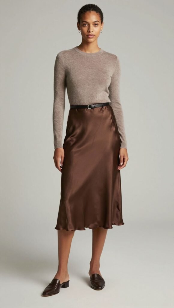 Graceful but grounded. A silk midi skirt in espresso with a fine-gauge crewneck in taupe looks refined. Add sleek mules and a minimal belt.