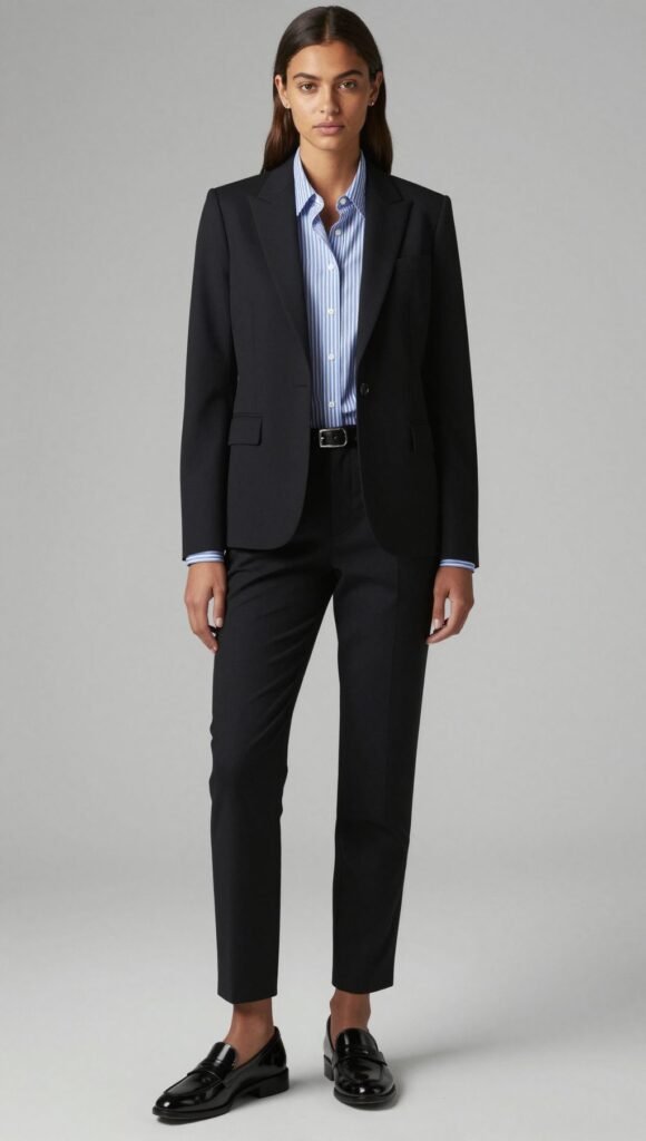 The sharp one. A black tailored suit with a blue-and-white striped shirt feels crisp. Finish with patent loafers and a silver buckle belt.
