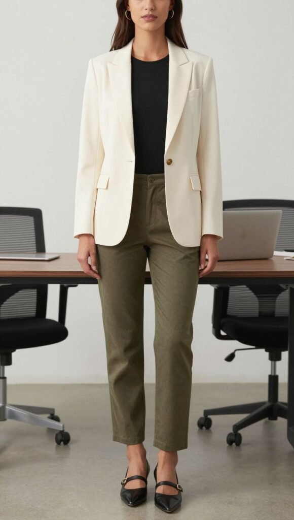 Earthy chic at the office. Style olive straight-leg trousers with a cream single-button blazer and a black bodysuit. Add pointed flats.