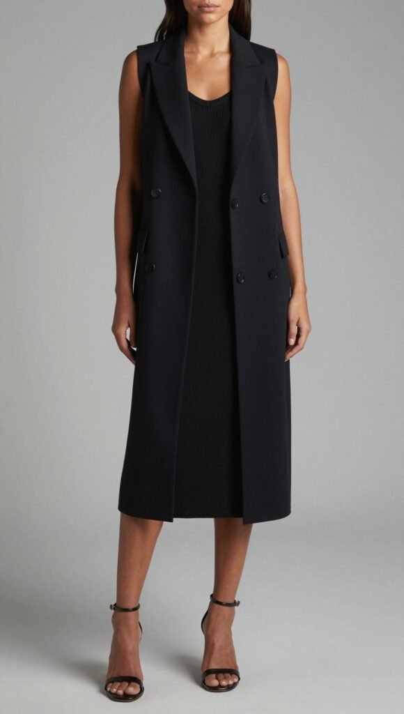Streamlined and clever. A black knit column dress under a longline tailored vest creates vertical lines. Pair with sleek ankle-strap heels.