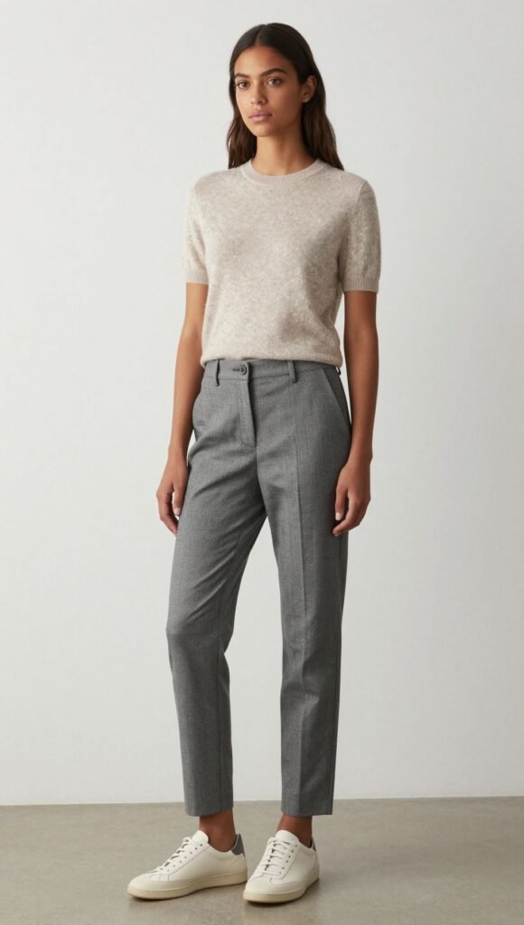 Quiet luxury, but office-ready. Wear gray flannel trousers with a short-sleeve cashmere tee in stone. Add minimalist sneakers or low block heels depending on the vibe.