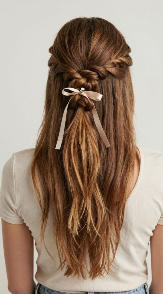 Can’t decide? Don’t! Pull the top section of your hair back, twist it into a small bun or braid, and secure it with a cute clip or ribbon. Let the rest of your hair flow freely. This style offers the best of both worlds, keeping hair off your face while still allowing some length to cascade down your back, adding a touch of romance.