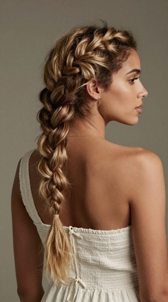 Channel your inner bohemian goddess with a loose, side-swept braid. Whether you go for a classic three-strand or a fancier fishtail braid, make sure it drapes over one shoulder. Gently pull apart the sections for a softer, more voluminous look. This style adds visual interest without overwhelming your neckline, giving off major whimsical vibes.