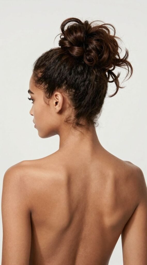 You want to show off everything? This is your move. A high, slightly undone bun lifts all your hair away, putting your shoulders and neckline front and center. Gather your hair into a high ponytail, then twist and pin it into a perfectly imperfect bun. Pull out a few face-framing pieces for that “oops, I just threw this up” chicness. It’s playful, it’s flirty, and it lets your dress do all the talking.