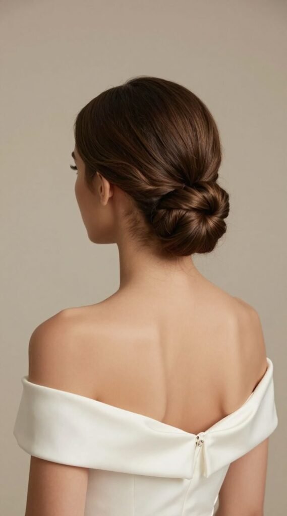 For peak elegance, a low chignon is simply unmatched. Gather your hair into a low ponytail, twist it into a refined bun, and secure it discreetly at the nape of your neck. Use a strong-hold hairspray to keep everything in place. This timeless style exudes sophistication, making it perfect for a formal off-the-shoulder gown.