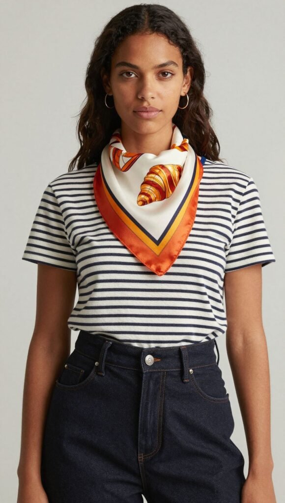 Channel your inner French girl, no croissant required. Grab a lightweight, square silk scarf with a bold print. Pair it with a classic striped tee, high-waisted dark wash jeans, and chic ballet flats. Fold the scarf into a triangle, then roll it into a thin band. Tie it loosely around your neck, letting the ends hang casually to one side. It adds instant sophistication and a pop of color without looking like you tried too hard. Très chic.