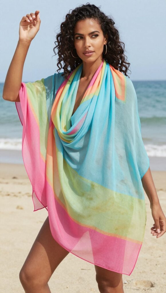 Beach goddess vibes, coming right up. Grab your largest, most vibrant rectangular scarf, ideally in a light, airy fabric like rayon or cotton. Perfect over your swimsuit or with a simple tank top and shorts. Hold the scarf horizontally behind you. Bring the two top corners over your shoulders and tie them in front, creating a flowing, open-front kimono effect. It’s a chic and practical cover-up that adds instant resort wear elegance. Hello, vacation mode.