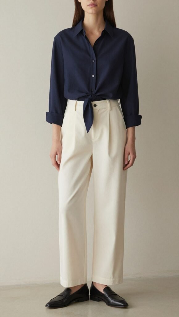 Sleek, clean, done. Tuck your navy shirt into cream wide-leg trousers and pretend you woke up like this. Add pointed loafers for the quiet luxury moment.