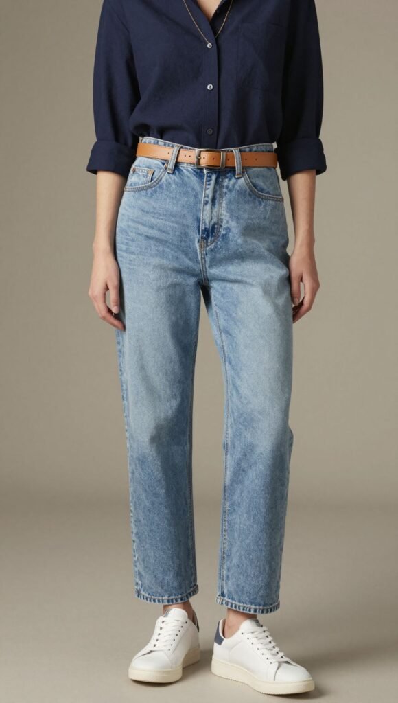 Match your navy shirt with light-wash jeans for contrast and casual cool. Throw on a tan belt and white sneakers to seal it.