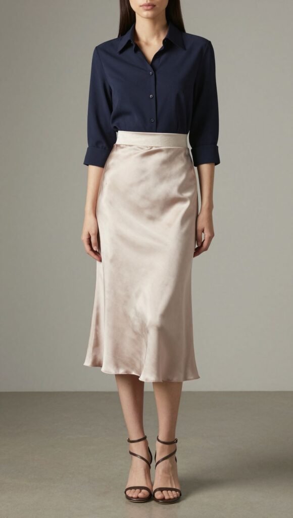 Balance the crisp navy shirt with a champagne satin midi skirt. Add strappy heels and call it dinner-ready.