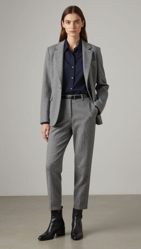 Swap the button-up blouse for your navy shirt under a grey blazer and matching trousers. Minimalist, bossy, comfy.