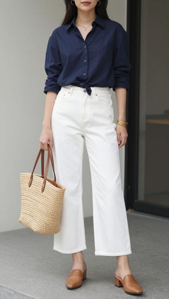 Keep it bright with white wide-leg denim and a crisp navy shirt. Finish with tan mules and a woven tote.