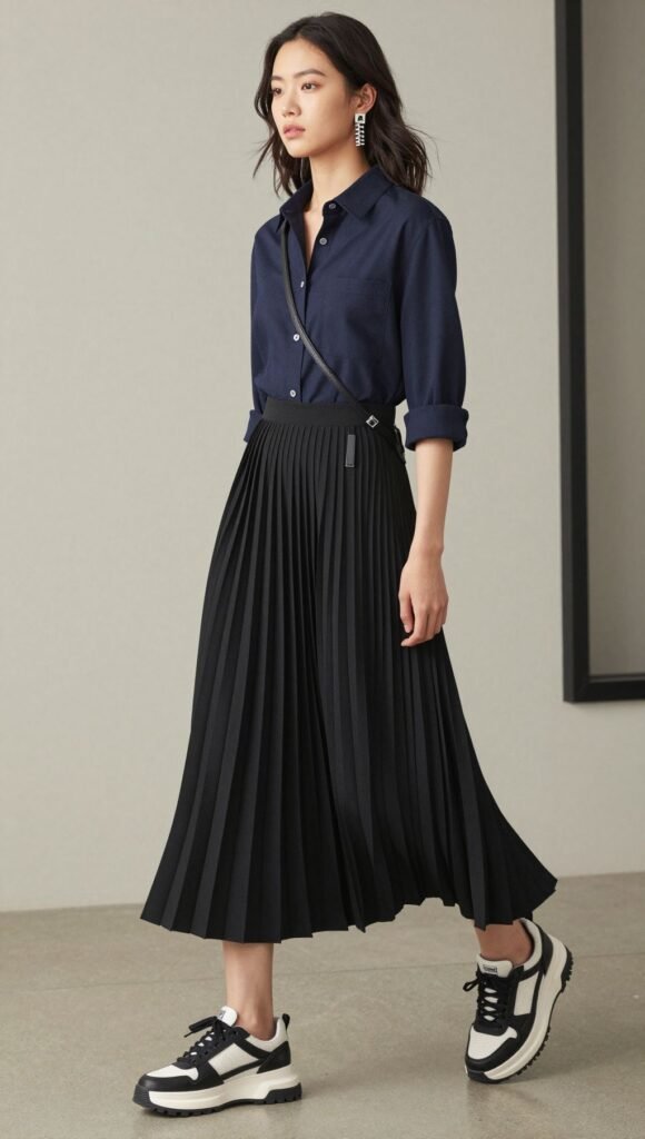 Go flow with a black pleated maxi and your navy shirt. Throw on chunky sneakers and a crossbody.