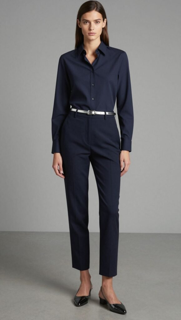 Lean in: navy shirt plus navy tailored trousers. Break it up with metallic flats or a silver belt.