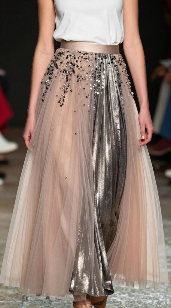 A dramatic tulle skirt, a heavily embellished midi skirt, or a metallic pleated maxi skirt paired with a simple black or white bodysuit or camisole. Pro tip: Ensure the top is fitted to balance the volume or detail of the skirt. You’ll achieve a perfect balance of drama and elegance, letting one piece truly shine.