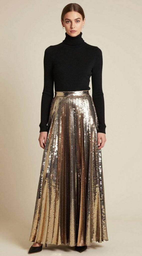 Consider a pleated metallic skirt with a simple black turtleneck or a metallic bustier top with tailored trousers. Pro tip: Mix your metals for an unexpected twist – a silver skirt with gold accessories? Bold move, but it pays off. You’ll look like you just stepped off a runway, ready for whatever the new year throws your way.