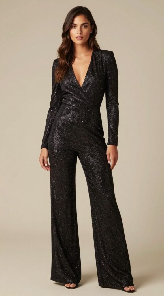 Look for a wide-leg glitter jumpsuit that shimmers with every move. Black or a deep navy with subtle sparkle keeps it chic, not childish. Pro tip: Pair it with sky-high heels to elongate your legs and make the jumpsuit truly sing. You’ll be comfortable, stylish, and ready to dance the night away without a care.