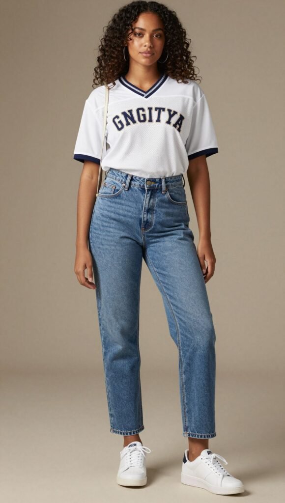 Take the jersey but make it fashion. Pair a team jersey with high-waisted straight jeans and crisp white sneakers. Add a mini crossbody for hands-free nacho action.