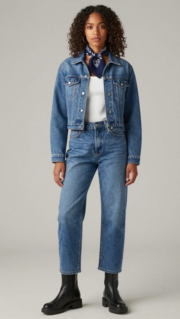 Denim on denim, but game day. A cropped denim jacket with relaxed jeans, ribbed tank, and chunky boots delivers.