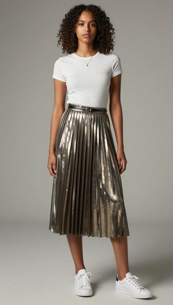 A little glam never hurt. Style a metallic pleated skirt with a fitted team tee and white low-tops.