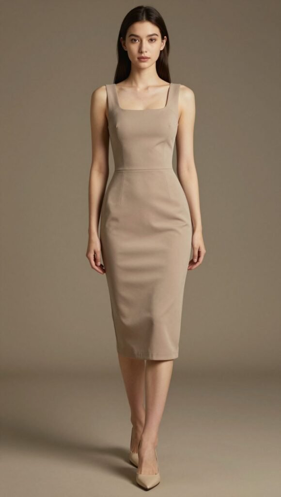 Why it works: Strong neckline + soft drape glides over hips elegantly.