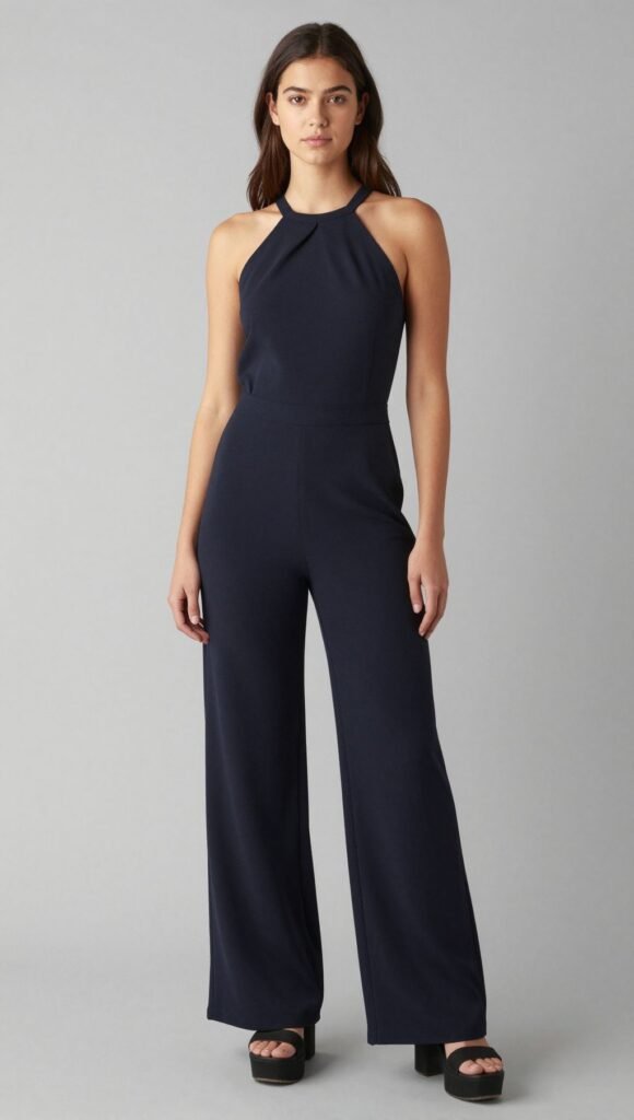 One-and-done chic. A halter-style jumpsuit frames shoulders and flows.