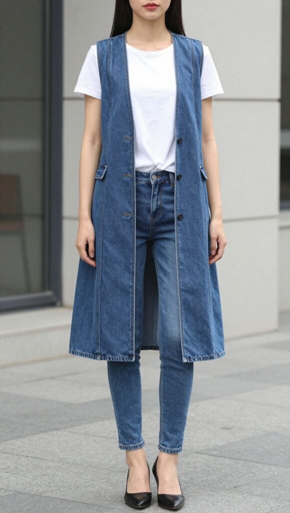 Street style but polished. A longline vest streamlines a tee and slim jeans.