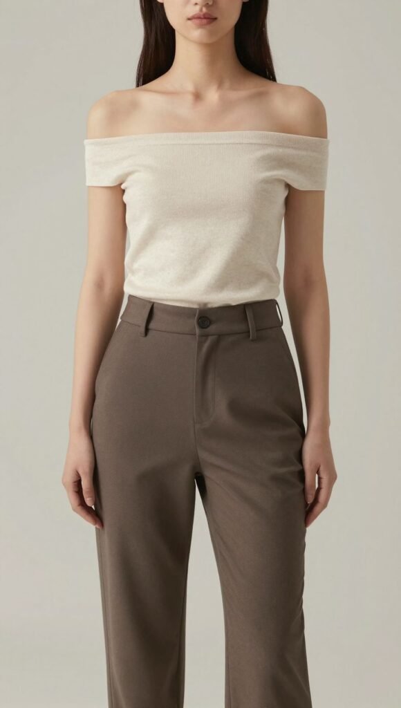 Collarbone cameo. An off-shoulder top draws the gaze upward, trousers keep it tailored.
