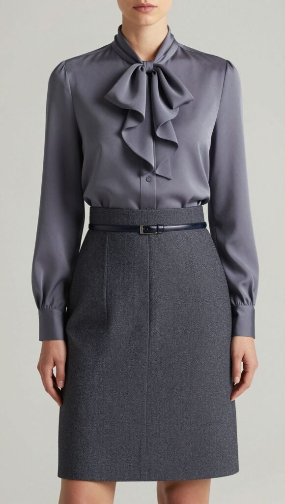 Drama up top, smooth below. A ruffled or bow-tie blouse balances an A-line skirt.