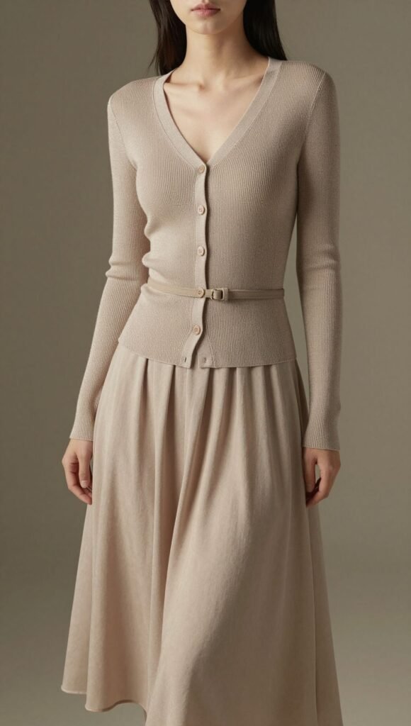 Soft and swishy. A fitted v-neck cardigan meets a knife-pleated midi.