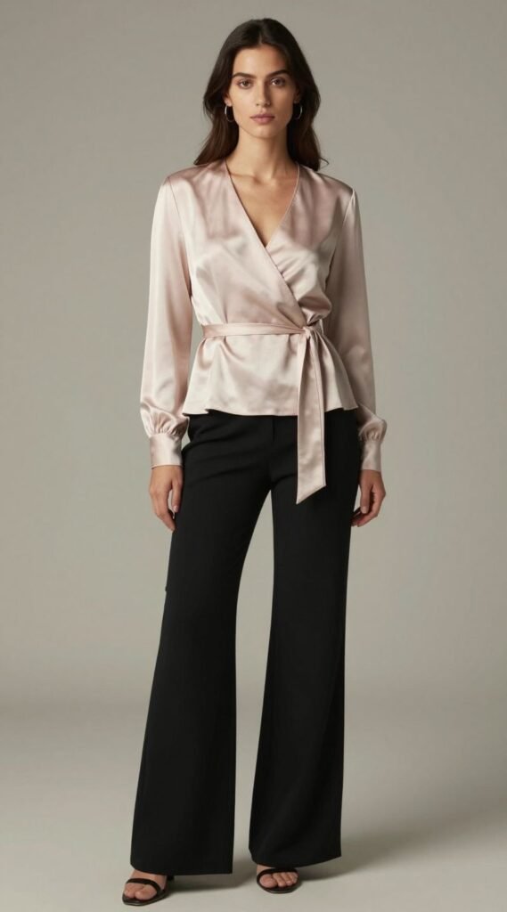 The wrap blouse in silk is pure genius. It’s adjustable, flattering for almost every figure, and creates that lovely V-neckline that elongates the torso. Plus, it cinches you in all the right places, because who doesn’t love a good waist definition?