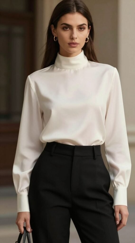 For those who love a bit of drama and a lot of sophistication, the high neck or mock neck silk blouse is your jam. It’s sleek, minimalist, and gives off major high-fashion vibes. Think modern art gallery chic.