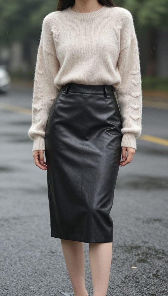 Pair it with a soft knitted sweater or a delicate blouse for a textural contrast. Finish the look with waterproof ankle boots. This outfit brings a touch of edgy sophistication to your work wardrobe, even when the skies are crying.