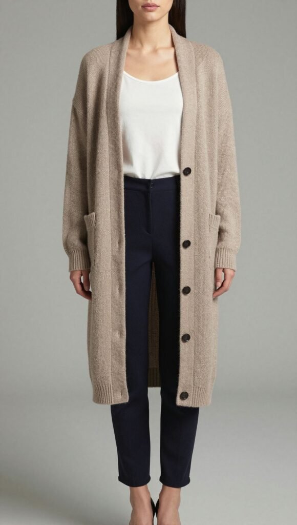 Sometimes, the best offense is a good defense, layered with style. A beautifully structured, long-line cardigan in a wool blend can act as a light outer layer.