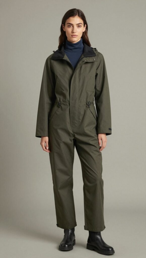 One-and-done dressing is a lifesaver, especially when you’re battling the elements. A well-fitted waterproof jumpsuit in a darker shade (think olive, navy, or charcoal) is pure genius.
